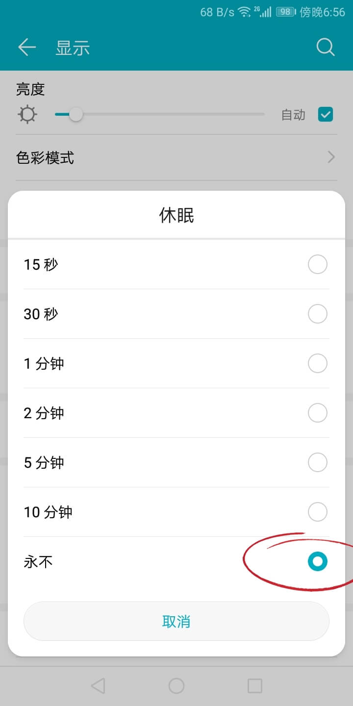 在系统「设置」-「显示」- 「休眠」- 点击永不(如果这里没有出现永不休眠选项,那么需要开启开发者模式才会出现这个选项,在关于手机里面,点击5次版本号即可开启)。