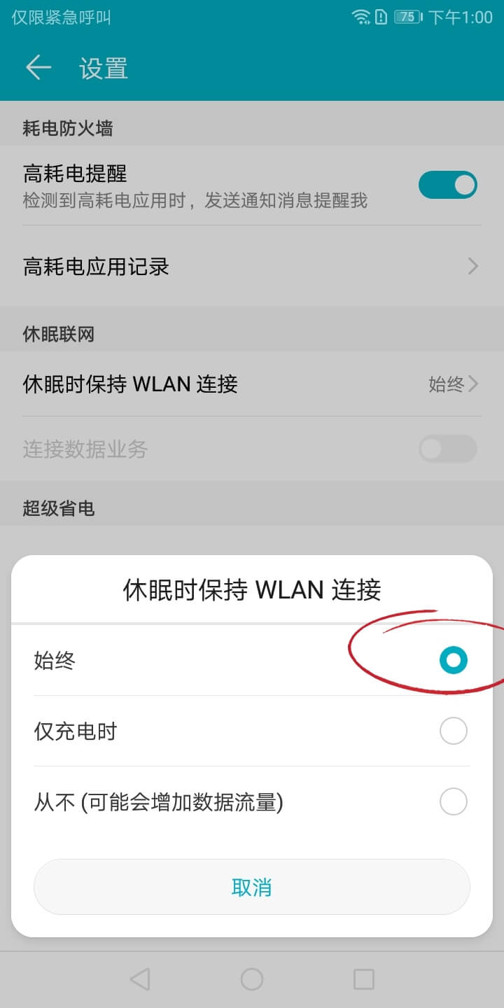 在系统「设置」-「无线和网络」-「WLAN」- 底部「设置」- 「在休眠状态下保存 WLAN 连接」选择始终。