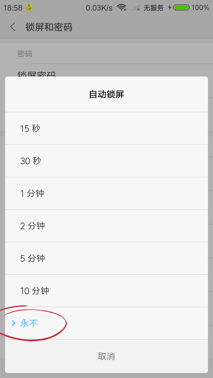 在系统「设置」-「锁屏和密码」-「自动锁屏」- 选择「屏幕永不休眠」。