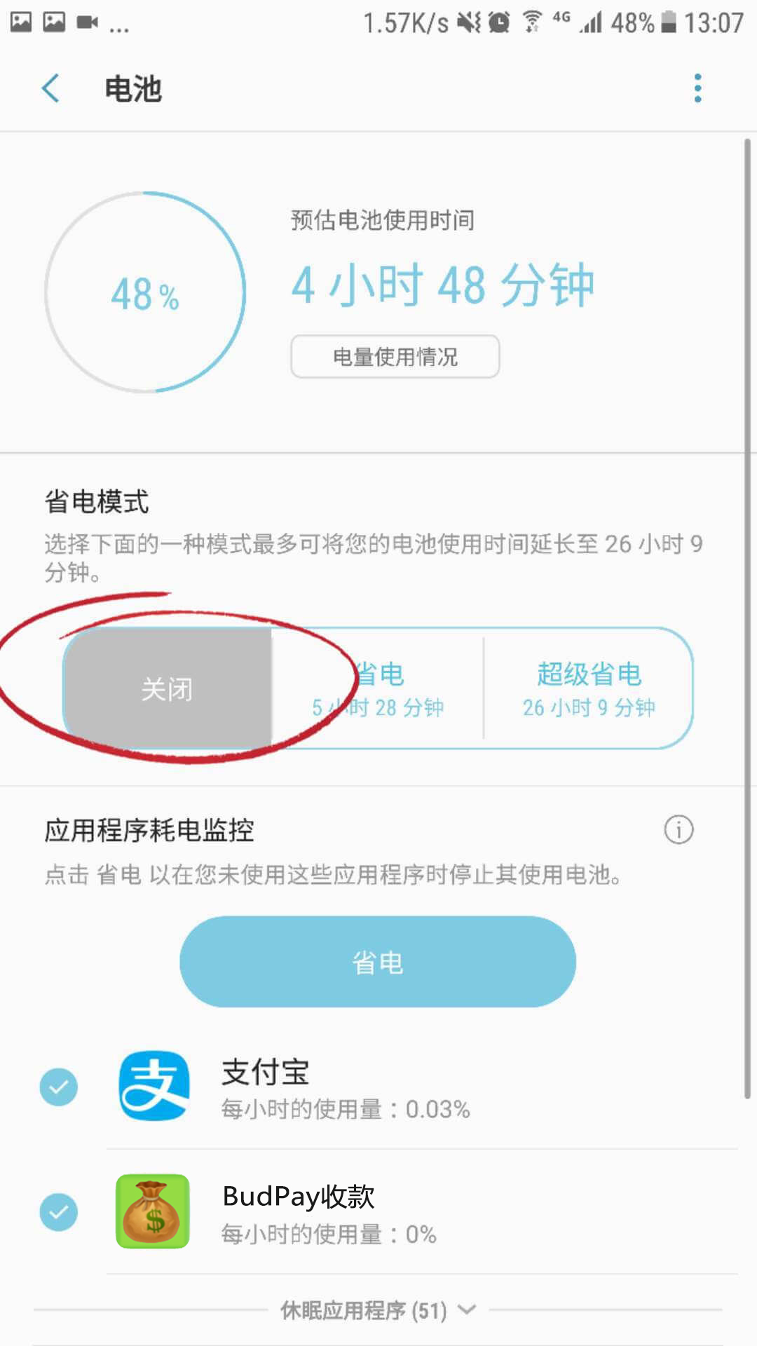 在系统「设置」-「电池」- 「省电模式」和「超级省电」- 点击关闭。